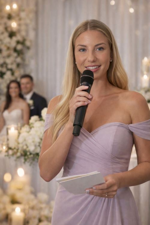 Som kvällens Toastmadame är hennes uppdrag att guida oss genom middagen, hålla koll på programmet, se till att alla som vill tala får göra det – och att ingen talar för länge. Hon är den som håller trådarna i handen, skapar flow, fångar upp stämningen och ser till att brudparet får precis den fest de förtjänar.